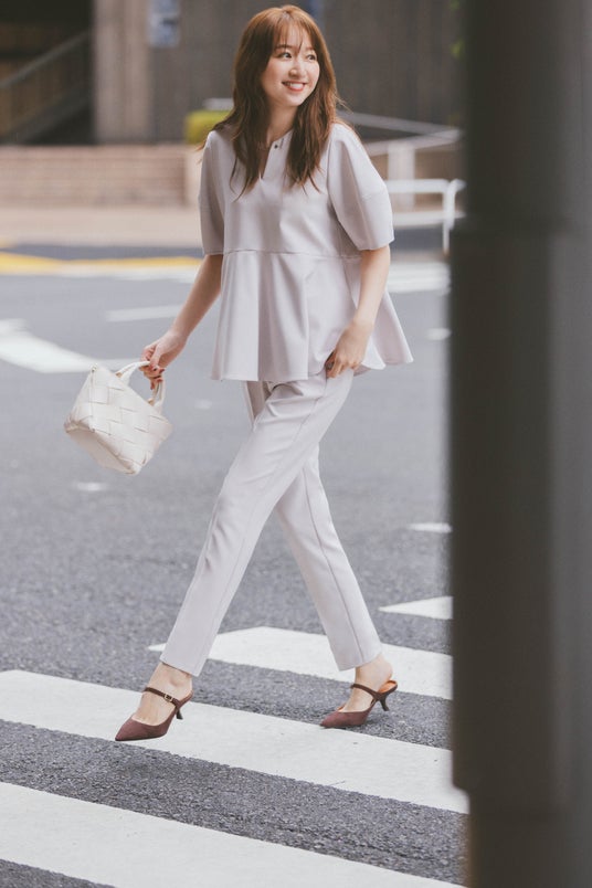 胸下からのフレア切り替えで脚長効果を狙えるブラウスとパンツの組み合わせ
