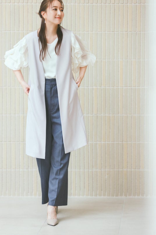 価格:パンツ¥16,500、ブラウス¥16,500、ジレ¥24,200、ジャケット¥25,300