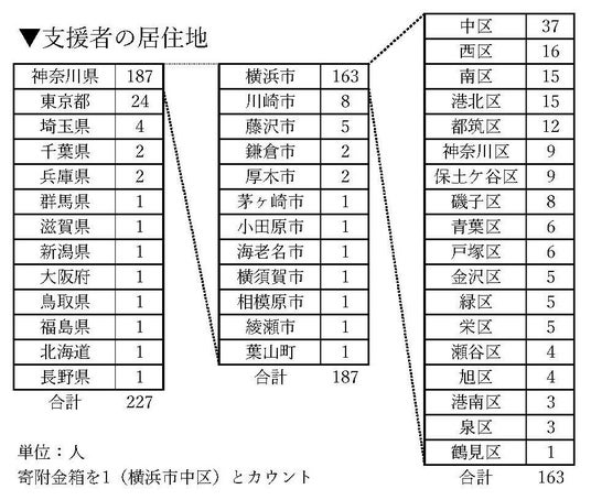 都道府県別の支援者数の内訳は右表の通りですが、神奈川県以外からのお申込も多数ありました。神奈川県内では横浜市からの申し込みが最も多く163名となりました。中でも当館が立地する中区が37名と多く、隣接する西区や南区からのお申込みが次に多い結果となりました。