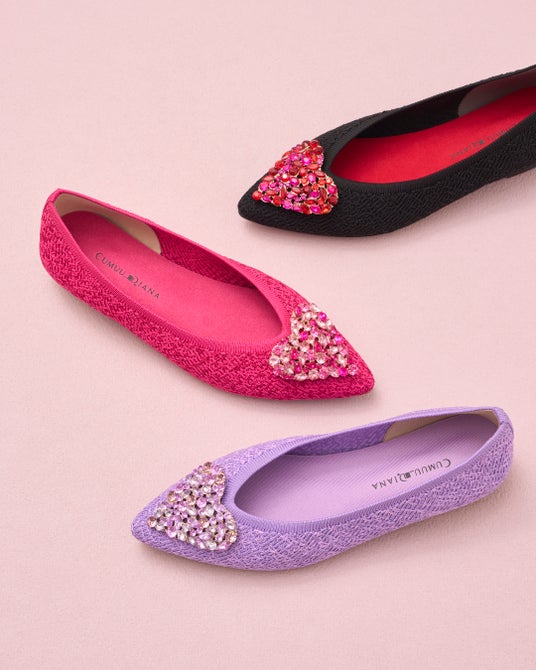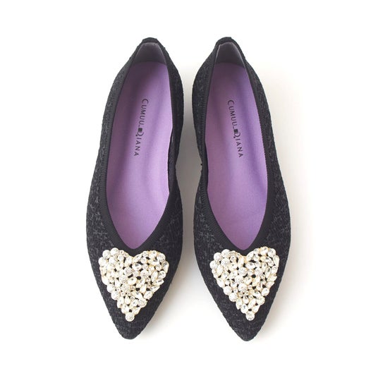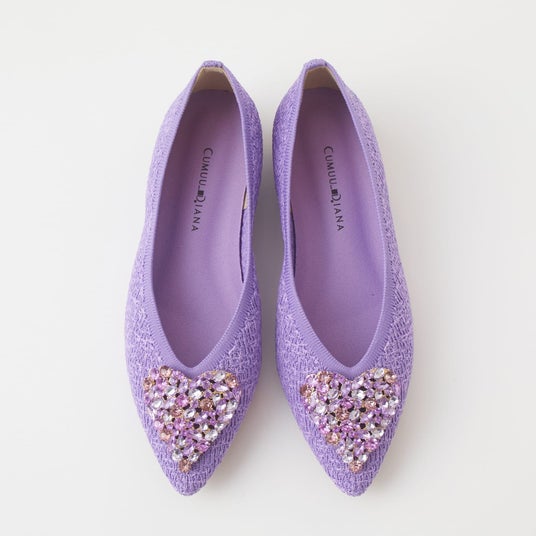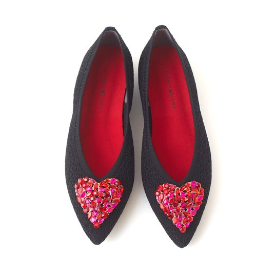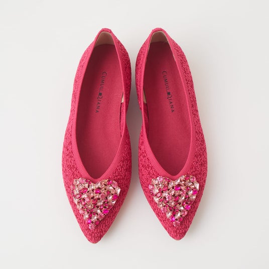 24SSにデビューし、2シーズン目となる24AWコレクションより、一足先にフラットシューズが発売となりました。大胆なきらめきが美しいハートビジューは、カラーバランスから、ビジューの配置までこだわった自信作。ツイード風に編み込まれたニットは、リッチ感がありながら、ニットの持つしなやかな履き心地で足を優しく包み込んでくれます。
