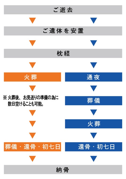ご逝去から通夜、葬儀・告別式、火葬という一般的な流れの中で、葬儀と火葬の時間を合わせることに苦慮するケースが散見されます。火葬場の予約に間に合わせるために葬儀・告別式がタイトになり余裕を持ったお見送りが出来なかったという声も聞かれます。