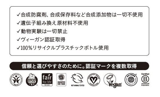 天然由来成分100%にこだわり、石油系界面活性剤、合成保存料、合成着色料、合成香料など合成添加物は一切使用していません。
