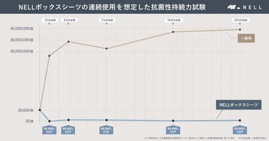 一方、ナノファイン抗菌加工が施された「NELL ボックスシーツ」では、1回目使用想定から 99.999%以上細菌の増殖を抑制しました。