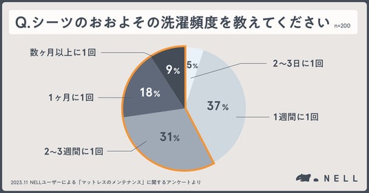 シーツの交換頻度は「1週間に1回」が目安ですが、「NELL」が200名を対象に実施した調査ではマットレスユーザーのおよそ6割が「数週間に1回程度」と回答しました。
