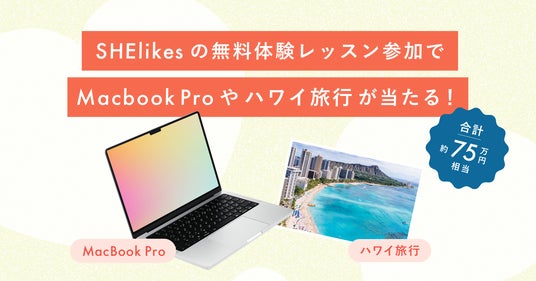 2024夏のキャンペーンの最初のお楽しみ企画に、ハワイ旅行やMacBook Proなどの豪華景品が抽選で当たるプレゼントキャンペーンを実施中です。対象期間中に「SHElikes」の無料体験レッスンを申し込み、参加・アンケート回答でプレゼントキャンペーンの対象となります。