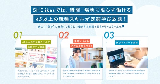 SHElikesは、時間や場所にとらわれずに働ける45以上の職種スキルが定額で学び放題の女性向けキャリアスクールです。Webデザイン・Webマーケティング・ライティングなどPCひとつで働けるデジタルスキル、クリエイティブスキルを幅広く学ぶことで、私らしい働き方の実現に伴走します。