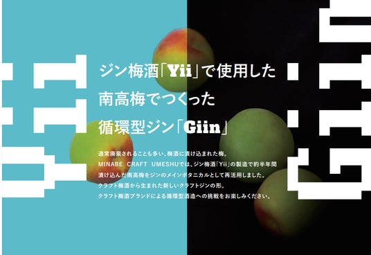 自社ECサイト「MINABE CRAFT UMESHU」の中でもメイン商品である、世界初*のジンベースクラフト梅酒「Yii(イー)」。今回ローンチするクラフトジン「Giin(ジーン)」は、その「Yii」を製造する際に使用した南高梅をメインボタニカルとして蒸留いたしました。