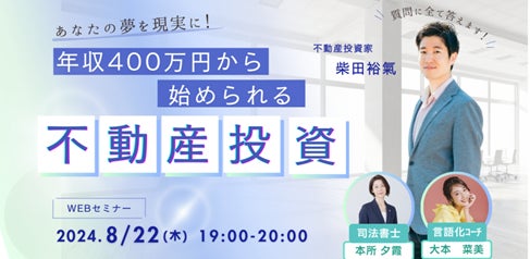 宅建業や不動産コンサル業を手掛ける株式会社Light Works(所在地:神奈川県横浜市 代表取締役:柴田 裕氣)では、8月22日(木)に「年収400万円から始められる不動産投資」をテーマにしたセミナーをWEB開催いたします。