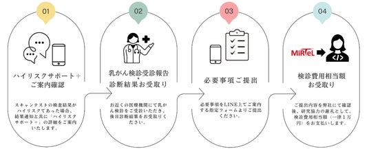 当社の連結子会社である株式会社ミルテル(本社:広島県広島市、代表取締役社長:加藤 俊也 以下、ミルテル)は、乳がんで苦しむ女性を1人でも減らすことができるよう、乳がん検診のきっかけ作りをサポートしたいという思いから、LINE完結型の乳がんリスク検査「スキャンテスト 乳がん」の検査結果がハイリスクの方で、ミルテルに乳がん検診の診断結果をご提供いただいた方に検診費用相当額(一律1万円)をお支払いする、早期発見支援付きサービス「スキャンテスト 乳がん ハイリスクサポート+」の販売を開始いたしました。