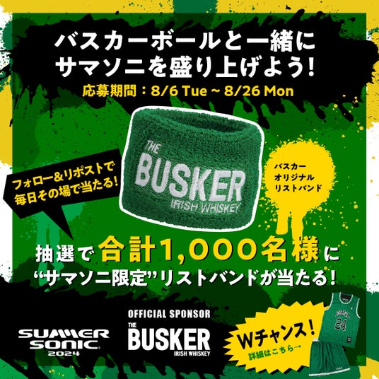 株式会社ウィスク・イー(東京都千代田区 代表取締役社長 遠山公隆)が輸入代理店を務めるアイリッシュウイスキーブランド『THE BUSKER(ザ バスカー)』(以下、バスカー)は、都市型ミュージックフェスティバル「SUMMER SONIC 2024」(以下、サマソニ)の出店を記念し、バスカーオリジナルグッズが当たるSNSキャンペーン「バスカーボールと一緒にサマソニを盛り上げよう!」を8月6日(火)~8月26日(月)まで期間限定で実施いたします。また、サマソニ当日のブースビジュアルやコンテンツ詳細も発表!今年もバスカーがサマソニを盛り上げます!