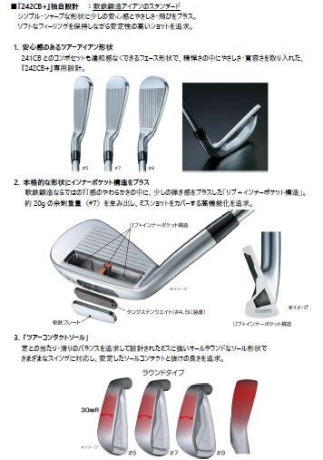 『242CB+』は、セミラージサイズの軟鉄鍛造キャビティアイアンです。『241CB』のコンセプトをベースに、シンプルな形状ながら、安心感とやさしさ・飛びをプラス。ソフトなフィーリングを保持しながら、「リブ+インナーポケット構造」を採用したことにより、軟鉄鍛造ならではの打感のやわらかさの中に、少しの弾き感をプラスした安定性の高いショットを追求しています。なお、同商品にはレフトハンド仕様※1もラインアップされています。