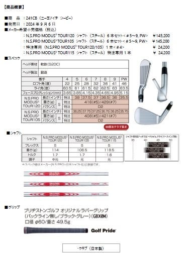 メーカー希望小売価格※2は、『241CB』は、#5~PWの6本セットで145,200円(N.S.PRO MODUS3 TOUR120/105シャフト仕様)、『242CB+』は、#5~PWの6本セットで145,200円(N.S.PRO MODUS3 TOUR105、N.S.PRO 950GH neo、Diamana Thump iB70シャフト仕様)、単品(#4)は『241CB』『242CB+』ともに、1本24,200円 にて発売します。