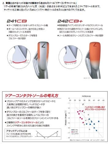 『241CB』は、ツアープロの要求に応えた本格軟鉄鍛造キャビティアイアンです。度重なるプロによる評価から生まれた、コースで性能を発揮する精緻に設計された鍛造アイアンで、狙った飛距離をイメージ通りの弾道・フィーリングで打つことを追求し、アイアン設計の三大要素である「打感」「顔」「抜け」をさらにブラッシュアップしています。また、ツアーの現場で鍛えられた進化したソールは、洗練されたヘッドシェイプと無垢の軟鉄鍛造ならではの“快芯”のフィーリングで、切れ味の良いショットを生み出す効果を追求しています。