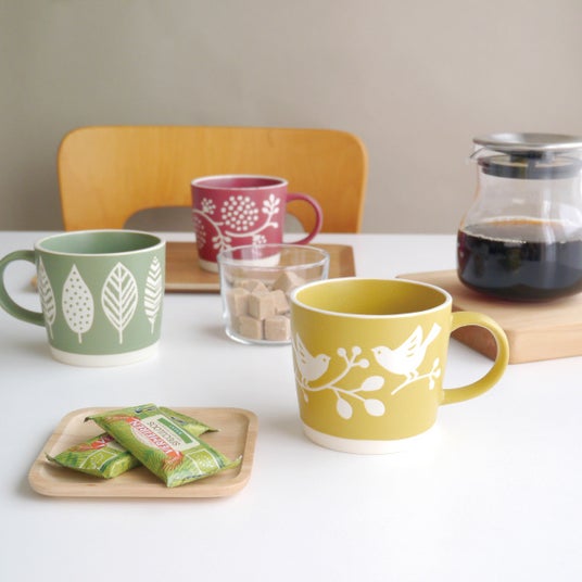 手前からバードYE、リーフGR、フラワーPK いずれも径9×高さ8cm、300mL / 各税込1,320円
