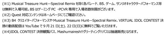 ・チケット:カジュアル(Quest)パス¥500、カジュアルパス¥1,000、Musical Treasure Hunt-Spectral Remixパス¥1,000、VIRTUAL IDOL CONTEST 決勝観覧パス¥1,000、Mashumairesh!!グリーティング!!パス¥3,969(すべて税込み表記)