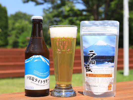 富士桜高原麦酒『戸田塩ライトラガー』は、一般社団法人「海と日本プロジェクトinやまなし」と共同で開発・醸造した、富士山の「天然水」と、駿河湾の「戸田塩」を使った限定ビールです。
