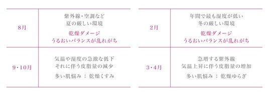 夏から秋へ向かう8月と冬から春へ向かう2月の季節の変わりめは、気温や湿度、紫外線量など外部環境の変化が起こりやすく、その影響を受けることで肌のうるおいバランスが乱れがちになります。美しく次の季節を迎えるために、先回りの「うるおい集中ケア」をルーティンにすることで、肌をすこやかに保ちます。