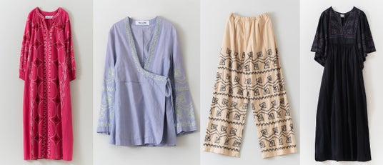 左から<COTTON LINEN PLANTS EMBROIDERY DRESS> ¥39,600-<COTTON LINEN PLANTS EMBROIDERY LONG SLEEVE BLOUSE> ¥33,000-<COTTON LINEN PLANTS EMBROIDERY SLEEELESS TOP> ¥30,800-<COTTON LINEN PLANTS EMBROIDERY SLEEELESS PANT> ¥30,800-
