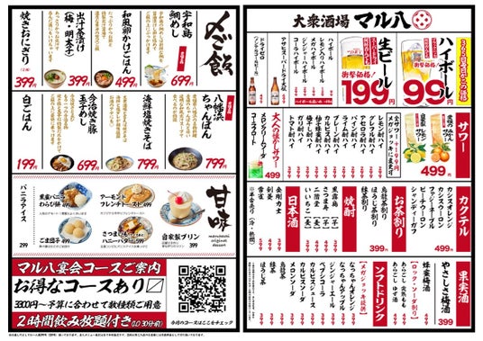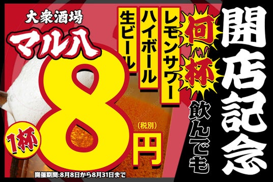 “早い・安い・旨い”をコンセプトに「近くにあると嬉しい」お店を目指して作り上げた「大衆酒場 マル八 松山大街道店」(FC運営:株式会社M&K、本社:愛媛県松山市、代表取締役社長 工藤真裕)が、2024年8月8日(木)の”8”が並んだ大安にグランドオープンいたします。これを記念して、赤字覚悟の大盤振る舞いで<生ビール・ハイボール・レモンサワーが何杯飲んでも1杯8円!>を、オープン記念キャンペーンとして、2024年8月8日(木)~8月31日(土)の期間限定で実施いたします。