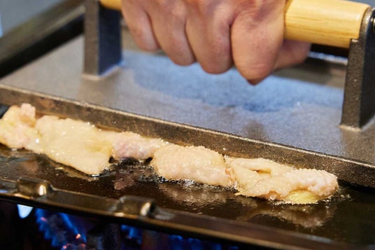 鉄板で上から押し潰すように焼き上げるのが今治風!
