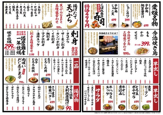 自信を持って提供する唐揚げから天ぷら、人気の居酒屋メニューまで多岐に渡るラインナップです。また地元・愛媛県が誇る名物も完備しました!鉄板で押しつぶしながら焼き上げる今治焼き鳥は399円(税別)、宇和島名物の鯛を使った料理も!また本店でも人気の播磨灘産の牡蠣は1個299円(税別)~とお手軽にご堪能いただけます。