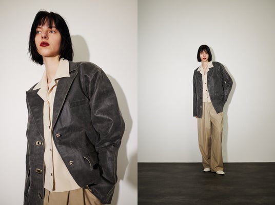 コットン・ポリステルの生地に、ヴィンテージレザーライクなルックスになるコーティングを施したハリのある生地を、ドロップショルダーのテーラードジャケットに落とし込みました。裾を断ち切りにすることでさらにクールな印象に。なんと言っても目を惹くフロントの金具ディティールが他にない特別感を演出し、とことんモードでマニッシュな、RIM.ARKこだわりの1着です。