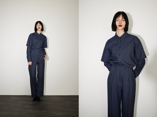 デニムの表情を見せつつ、シワになりにくいポリエステルならではの扱いやすさを兼ね備えたFake denim SH。重ね着をしているような袖の立体シルエットをポイントに、全体はすっきりと見せたサイズバランスがカジュアルになりがちなデニムスタイルをクリアでかっこいいテイストに仕上げてくれます。色落ちの心配もないのでクリーンな状態で長く着用いただけます。Fake denim PTはすっきりとしたサイズとシルエットのスラックスにリベットやパッチポケットでデニムテイストを加え、カジュアルさと上品さを感じる一本に仕上げました。シャツとボトムのセットアップコーデは洗練された大人スタイルを確立してくれます。