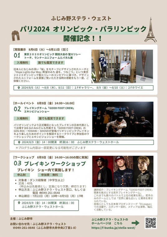 パリ2024オリンピック競技大会より正式種目となった「ブレイキン」日本代表・湯浅亜美選手が所属するブレイキングチームのメンバーを招き、ブレイキンをより楽しむためのポイントを解説するトークライブとエキシビジョンショー、参加型ワークショップを開催します。また、東京2020オリンピック競技大会の聖火リレートーチなどの展示も同時期に開催します。