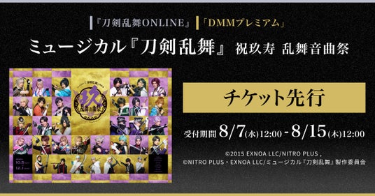 合同会社DMM.com(本社:東京都港区、会長 兼 CEO 亀山敬司、https://dmm-corp.com/ 以下DMM )は、DMMグループの合同会社EXNOAが開発・運営、株式会社ニトロプラスが世界観・シナリオ・キャラクターデザインを担当している刀剣育成シミュレーション『刀剣乱舞ONLINE』を原案とする「ミュージカル『刀剣乱舞』 祝玖寿 乱舞音曲祭」について、『刀剣乱舞ONLINE』ゲーム内チケット先行ならびに、月額550円(税込)で総合動画配信サービス「DMM TV」の見放題作品視聴やDMMの各種サービスをお得に利用できる「DMMプレミアム」の会員向けチケット先行の申し込み受付を開始いたしました。