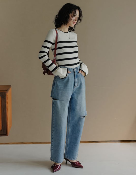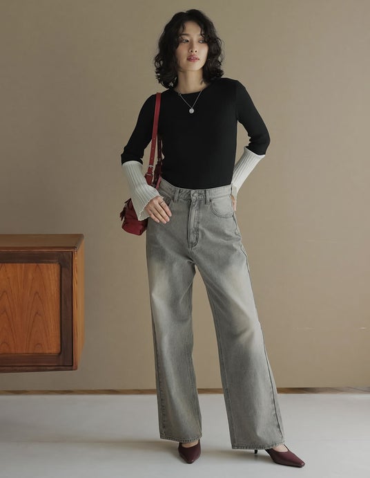 [2024 AUTUMN PRE ORDER]クルーネックフレアスリーブ配色リブニットトップス