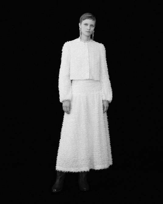 Blouson ¥49,500 Blouse ¥39,600 Skirt ¥39,600 Earrings ¥31,900/rada Boots ¥39,600