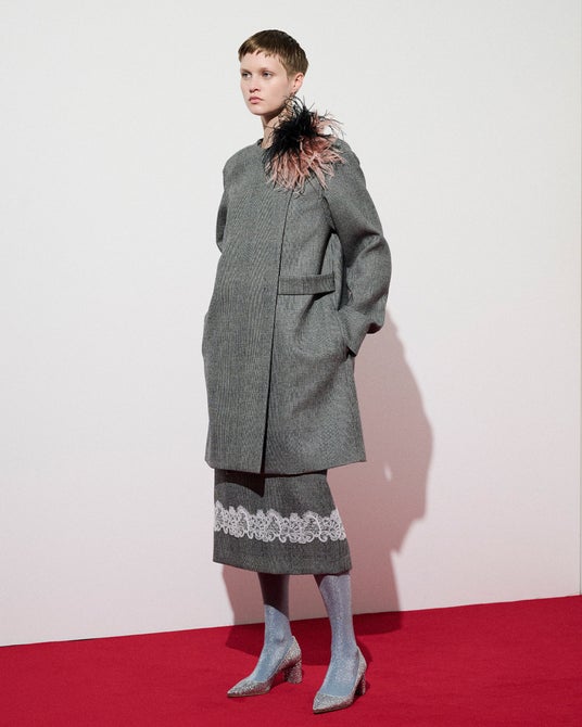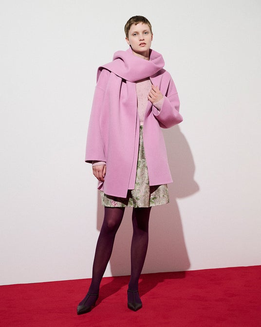Coat ¥74,800 Pullover ¥35,200 Skirt ¥59,400 Shoes ¥62,700/BRENTELLA