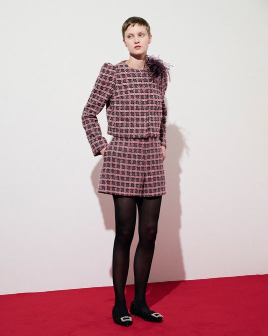 Coat ¥99,000 Skirt ¥41,800 Brooch(brack) ¥18,700/Exquisite J Brooch(pink) ¥18,700/Exquisite J Shoes Not for sale