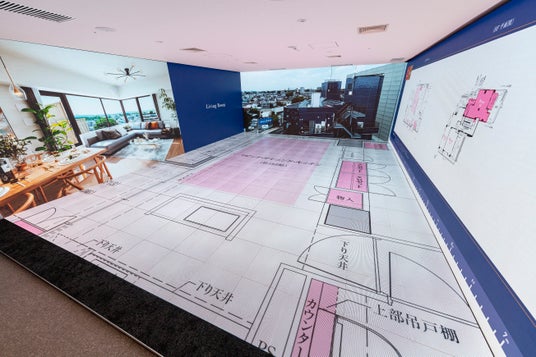 壁面3面および床面に大型のLEDスクリーンを設置しました。図面やVRモデルルームをLEDスクリーンに投影し、全ての販売住戸の広さや天井高、開口部の位置などを実寸大で確認できます。床面に投影する図面は、操作用タブレットと連動しているため、タブレットで画面をスクロールすると、投影している床面の図面もスライドでき、図面全体を確認することが可能です。図面上を歩けるため、生活動線の確認や家具配置のシミュレーションがしやすくなり、さらに、住戸内からの眺望も確認できるので、入居後の生活をよりリアルにイメージしていただきやすくなりました。4面を用いた大画面に映像を投影することで、あたかも実際の部屋にいるような没入感を体感いただけます。また、建物のデザインや共用部の設えなど、マンション全体の雰囲気も、大画面でご確認いただける環境にしました。