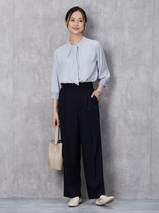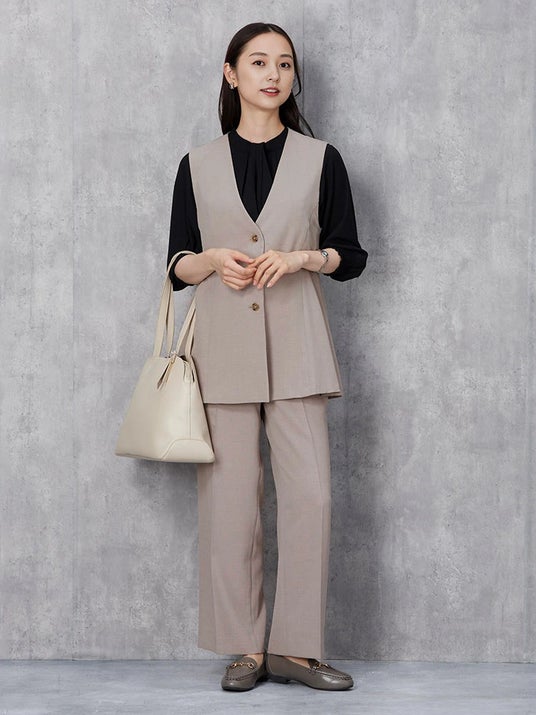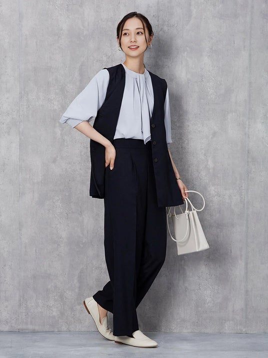 ペプラムジレとのセットアップで合わせても、単品使いでも着用しやすいシンプルなワイドパンツは、清涼感のある風合いと、ワイドすぎないシルエットが洗練された大人の雰囲気を演出。締めつけのないバックゴムのフィット感、ワイドパンツならではのリラックスさが快適な履き心地です。