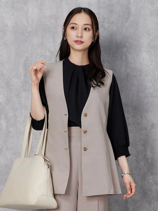 高めの切り替えシェイプがスタイルアップを叶えてくれ、メリハリのあるスタイリングが叶うペプラムデザインのジレ。シフォンやジョーゼットのブラウスをインナーにしてきれいめな着こなしを楽しむも良し、広めに開いたアームホールを活かしてTシャツをインナーにしたレイヤードスタイルでリラックスしたカジュアルコーディネートを組むも良しなマルチスタイリングアイテムです。シワになりにくくさらっとした肌触りが、今の季節に着やすい素材感もポイント。