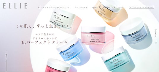 これまでは主力商品である年齢別オールインワンクリーム「E.パーフェクトクリーム」のほか、個々の展開となっていたサイトをモール型に統合し、さらにポイント付与システムの統合を行うことで、さまざまな志向、属性のお客様が複数のブランドを知るチャンスを拡大してまいります。新サイトは「ELLIE公式オンラインストア」の名称で本日より運用がスタートしており、定番のスキンケア、ヘアケア、ボディケア等合計38品目が購入可能です。