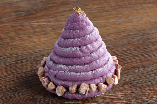 洋梨のムースの周りに紫芋のクリームを絞り、ナッツを散りばめたきれいな紫色のモンブラン。洋梨の濃厚な甘みと紫芋の素朴な甘さをお楽しみください。