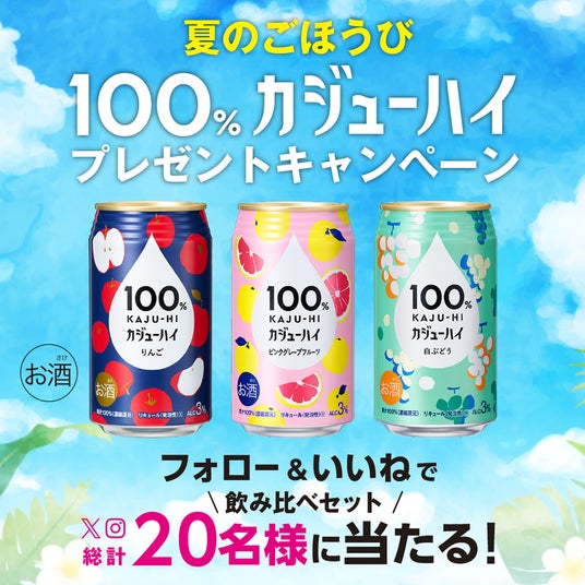 富永貿易株式会社(本社:兵庫県神戸市)は、チューハイ『100%カジューハイ』公式SNSアカウントにて、定番フレーバー3種×各2本(計6本)が総計20名様に当たるプレゼントキャンペーンを実施いたします。