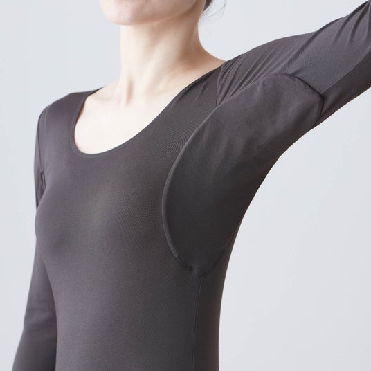 ・防水シート入り汗取りパッドの形状を工夫し、脇に縫い目のない仕様にすることで、縫い目からの汗ジミを防ぎます。