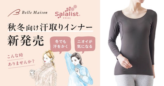 「サラリスト」は、2010年の発売以来、累計848万枚(※1)を販売しているベルメゾンオリジナルの汗取りインナーブランドです。脇汗・汗ジミ・汗のベタつき、ニオイなどの汗の悩みを解消し、快適に過ごせるよう開発した「サラリスト」は、吸水速乾機能を備えた本体生地を採用することで、大量の汗をかいてもサラサラとした肌ざわりを感じられる機能性の高さが特徴です。今回の秋冬向けの新商品は、吸水速乾機能に加え抗菌防臭加工を施すことにより雑菌の繁殖を抑え、ニオイもセーブします。脇の部分には防水シート入りのベルメゾンオリジナル三層構造パッドを採用し、見た目やニオイなどの悩みが出やすい脇汗の悩みにも対応します。