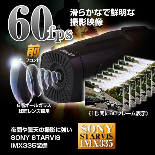自然でなめらかな映像を実現する60fps対応。さらに夜間や曇天の撮影に強いSONY STARVIS IMX335を備えた120° 広角レンズ、最高画質は前1カメラで 2K(2560×1440P) 59fps。前後2カメラで 2K+2K (2560x1440P) 28fps 同時録画も可能です。