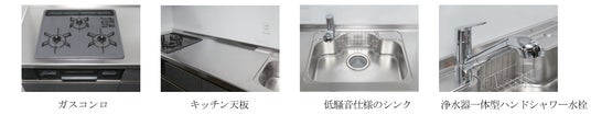 高温自動温度調節機能付のガスコンロ、汚れが付きにくくお手入れ簡単なキッチン天板、大型の調理用具も洗える大きめのシンクを採用。