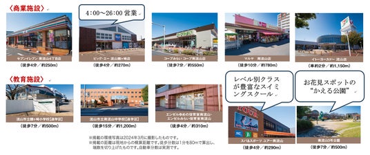 本物件周辺には、価格の安いディスカウントストア、親子で参加できるスイミングスクールなど、