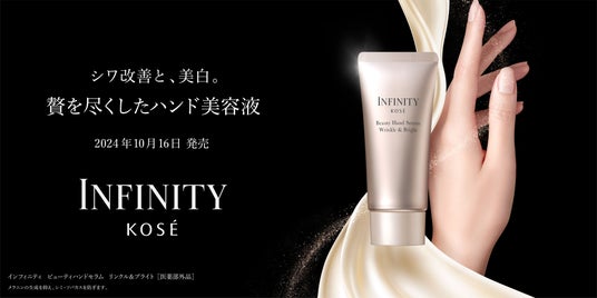 株式会社コーセー(本社:東京都中央区、代表取締役社長:小林 一俊)は、企業名「KOSE」を冠するハイプレステージブランド『インフィニティ』から、2つの有効成分で「シワ改善」と「美白*」のW効能を叶える大人のためのハンド美容液「インフィニティ ビューティハンドセラム リンクル&ブライト (医薬部外品)」を、2024年10月16日より全国の『インフィニティ』取り扱い店舗(ドラッグストア、GMS)とMaison KOSE(直営店とオンラインサイト)、一部ECなどで発売します。