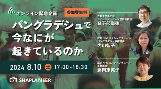 1972年より50年以上、独立直後のバングラデシュで「貧困のない社会」をめざし活動する、国際協力NGO「シャプラニール=市民による海外協力の会」(東京都西早稲田 代表理事:坂口和隆、以下シャプラニール)は、2024年8月10日(土)17時より、オンライン緊急企画「バングラデシュで今何が起きているのか」を開催します。