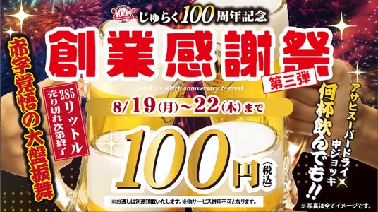 ホテルやレストラン事業を展開する株式会社 聚楽(本社:東京都千代田区、取締役社長:加藤 治、以下「当社」)は、今年創業100周年を迎えました。夏の感謝祭は8月19日~22日の4日間、酒亭じゅらく上野店・お茶の水店、串揚げじゅらく上野店・アメ横店・新橋店にて、アサヒスーパードライ中ジョッキを1杯100円(税込)でご提供いたします。