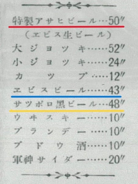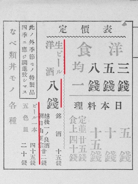 1927(昭和2)年には生ビール8銭、ビール(瓶)は45銭で提供しており、また当社に残る資料のうち1934(昭和9)年のメニュー表の中で「エビスビール38銭」と、初めて銘柄の表記を確認しました。そして1937(昭和12)年に開業した浅草聚楽(現在も営業中)では、アサヒ、エビス、サッポロの3銘柄を販売していました。