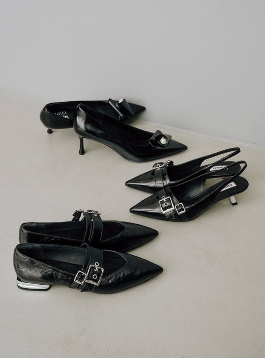 メリージェーン風のシューズデザインで、上品見えかつ大人かわいい足元に。