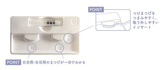 つけまつげの台紙に、左右が一目で分かるよう記載があります。また、つけまつげを台紙から取り外しやすいように、つけまつげを留めている土台をつけまつげより一回り小さくしています。初めての方でも使いやすい工夫です。